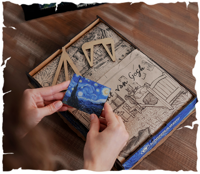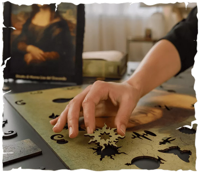 The main masterpiece of the Italian Renaissance, the most mysterious and famous painting in the world. They say Da Vinci fumed his workshop with smoke to achieve a slight blur of lines and colors. We carefully preserved the unique tone of the painting, the slightest cracks in the coating and the style of painting of the artist. Whimsy pieces of the puzzle will show you the artist's hobbies, and the history of his formation. You can even collect the name of the picture using lettered pieces! Premium lacquer gift packaging, and craft paper with drafts and sketches by Da Vinci inside. Each box contains a mini easel with a copy of the picture, which will serve you as a hint when assembling the puzzle.
