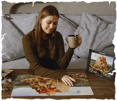 Bruegel's minute details and incredible colors will immerse you in the world of ancient biblical legends and the Dutch Renaissance. We followed the master's footsteps and used layer-by-layer volumetric printing to achieve the effect of multiple layers. Take a look at this volumetric illustration! Layer by layer, step by step you will build your Tower. Among the whimsy pieces of the puzzle there are Bruegel's encrypted name, his paintings and hobbies. And, of course, hidden thematic mini-puzzles so you could immerse yourself into the distant era of the artist.