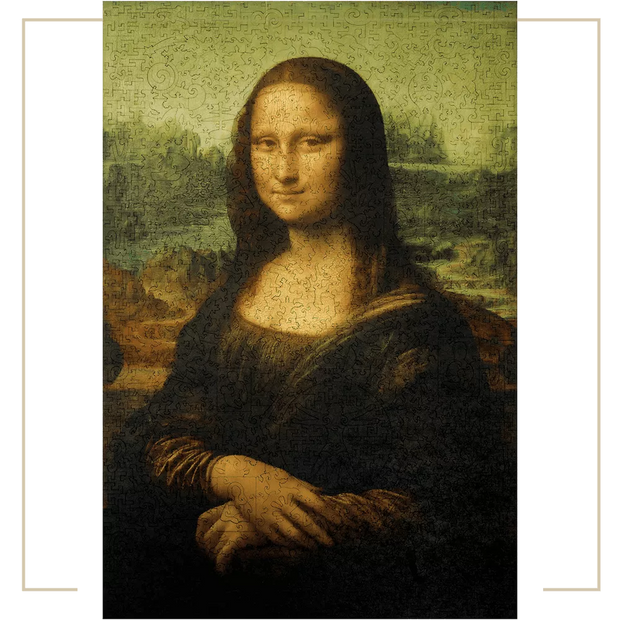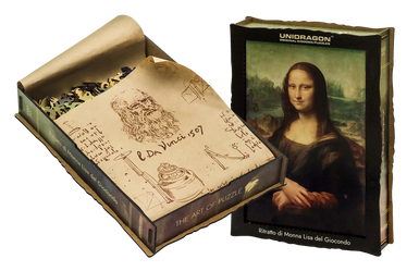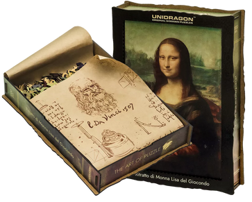 The most mysterious and famous painting in the world. We carefully preserved the unique tone, the slightest cracks in the coating and the style of painting of the artist. Whimsy pieces will show you the artist's hobbies, and the history of his formation. Premium gift box with craft paper with drafts and sketches by Da Vinci inside.
