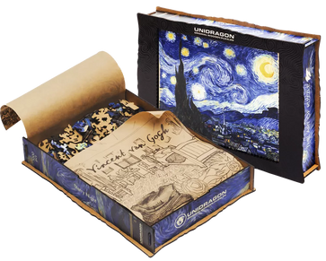 The most famous view from the window in the world. The predawn sky, stars and flames of cypress trees. The puzzle cover imitates Van Gogh's brush stroke, and the whimsy pieces tell the story of his difficult life and incredible creative work. Find more than 25 hidden mini-puzzles inside: self-portrait, sunflowers, chair and other recognizable pieces of art.