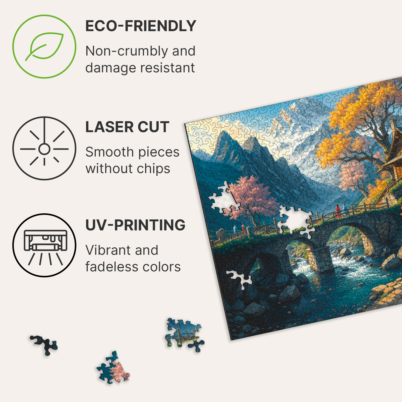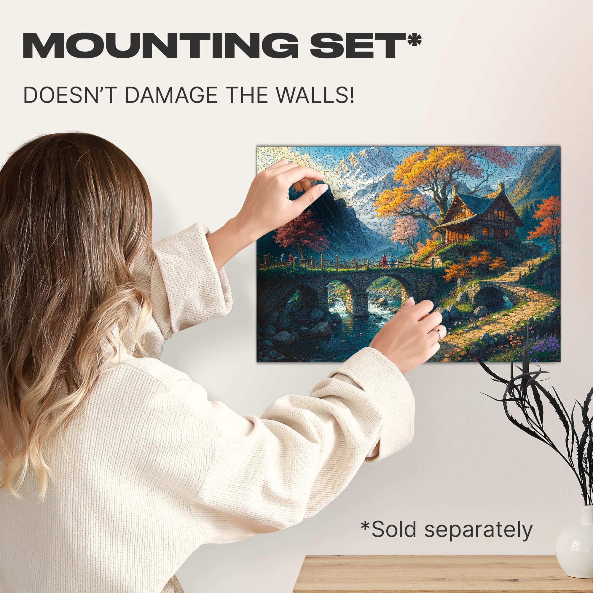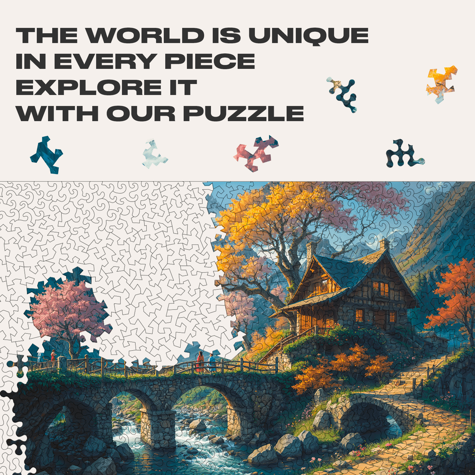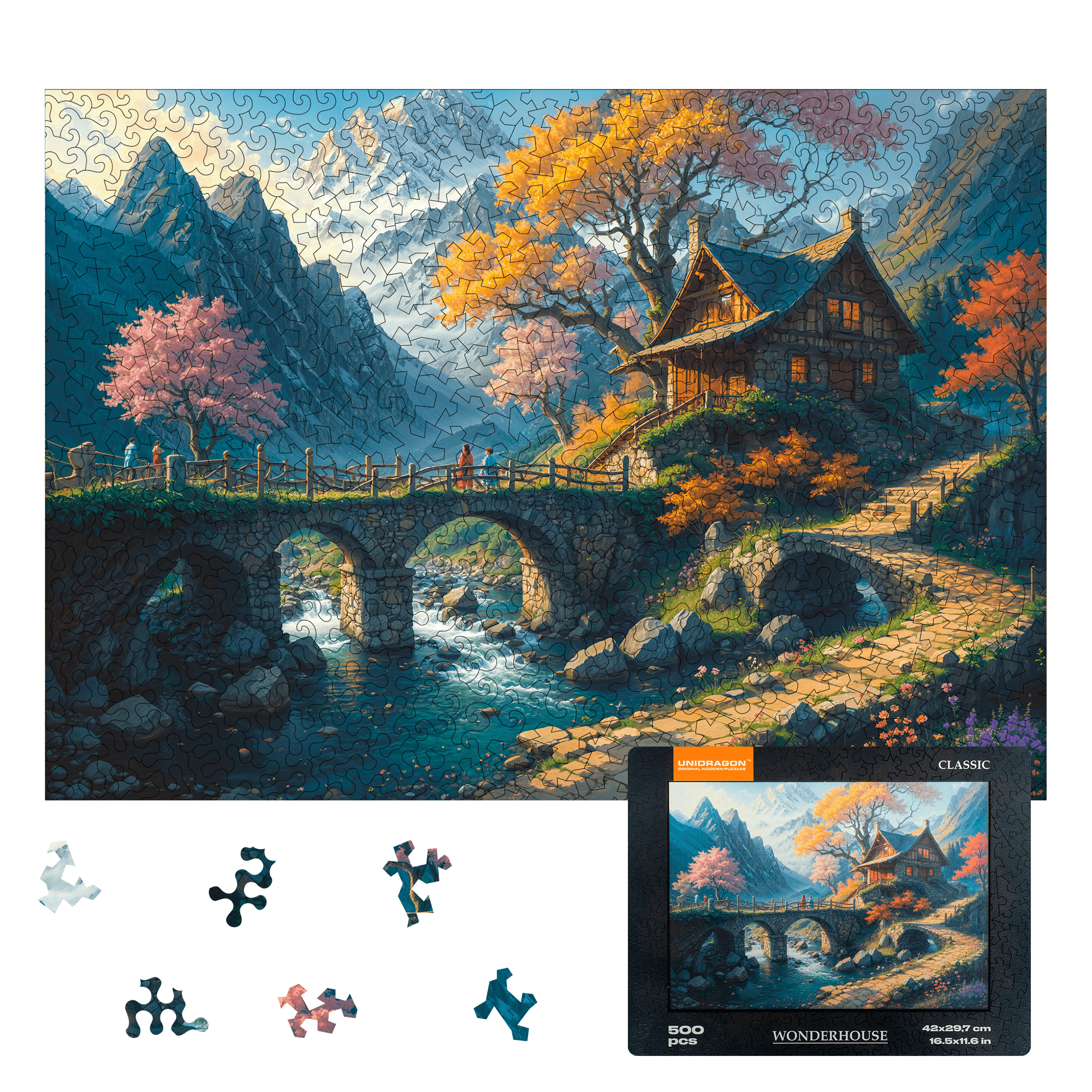 And nature gave us a hint on the cut of this Classic Wonderhouse Jigsaw Puzzle. Mountain peaks are made of pieces with sharp edges. They are reminders of life's challenges and rapidly changing circumstances. The house and the stream babbling in front of it are made of pieces with smooth outlines. They symbolize family warmth, support from loved ones, and the comfort of a happy home.