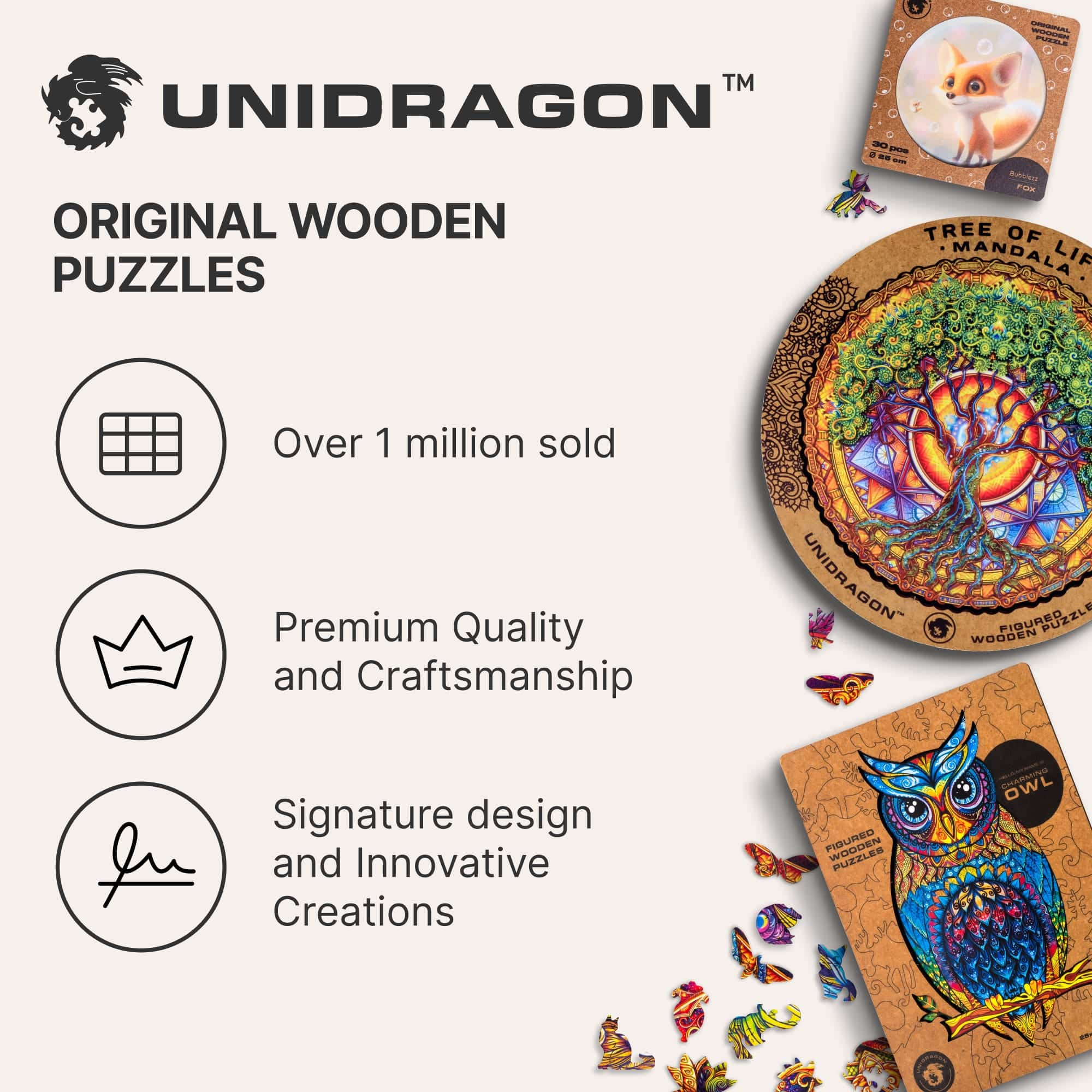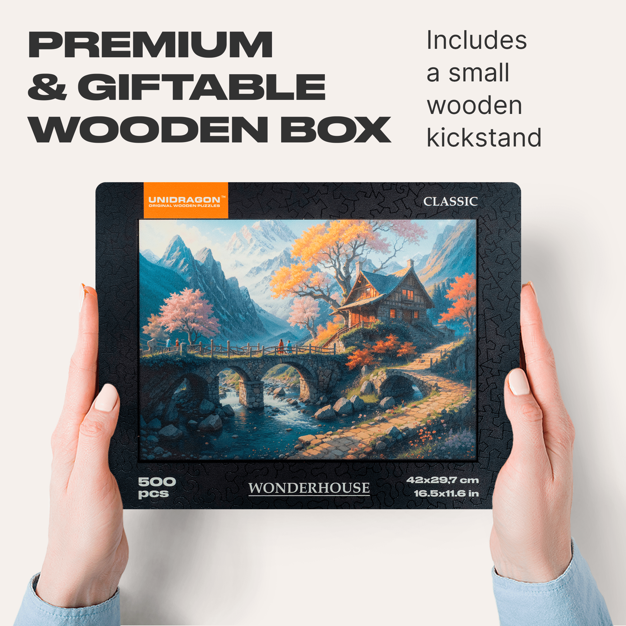 We've updated the packaging to make it even more stylish. The black outline and lacquered details on the lid highlight key elements of the illustration. Crafted with care, each of the 500 pieces is cut from durable HDF, ensuring your Wonderhouse Wooden Puzzle stands the test of time. Walk the path to the hidden valley, and let the memory of it remain with you for a long time.