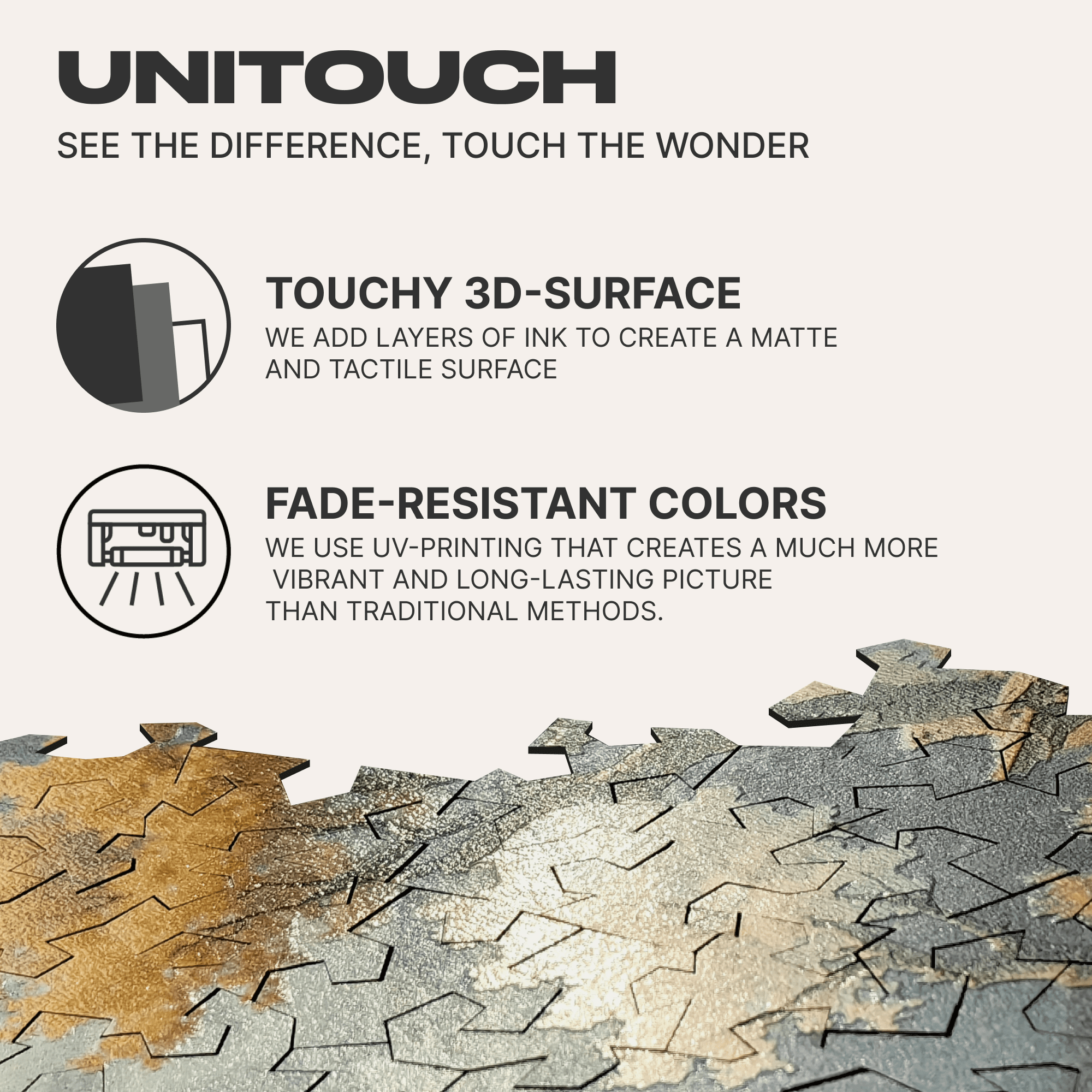 Thanks to Unitouch technology, the picture comes alive, adding a three-dimensional touch, allowing you to feel each detail of this magical place. Feel the rocks' edges and the running water's smoothness on your fingertips, and immerse yourself in the peace that the local mountains exude.