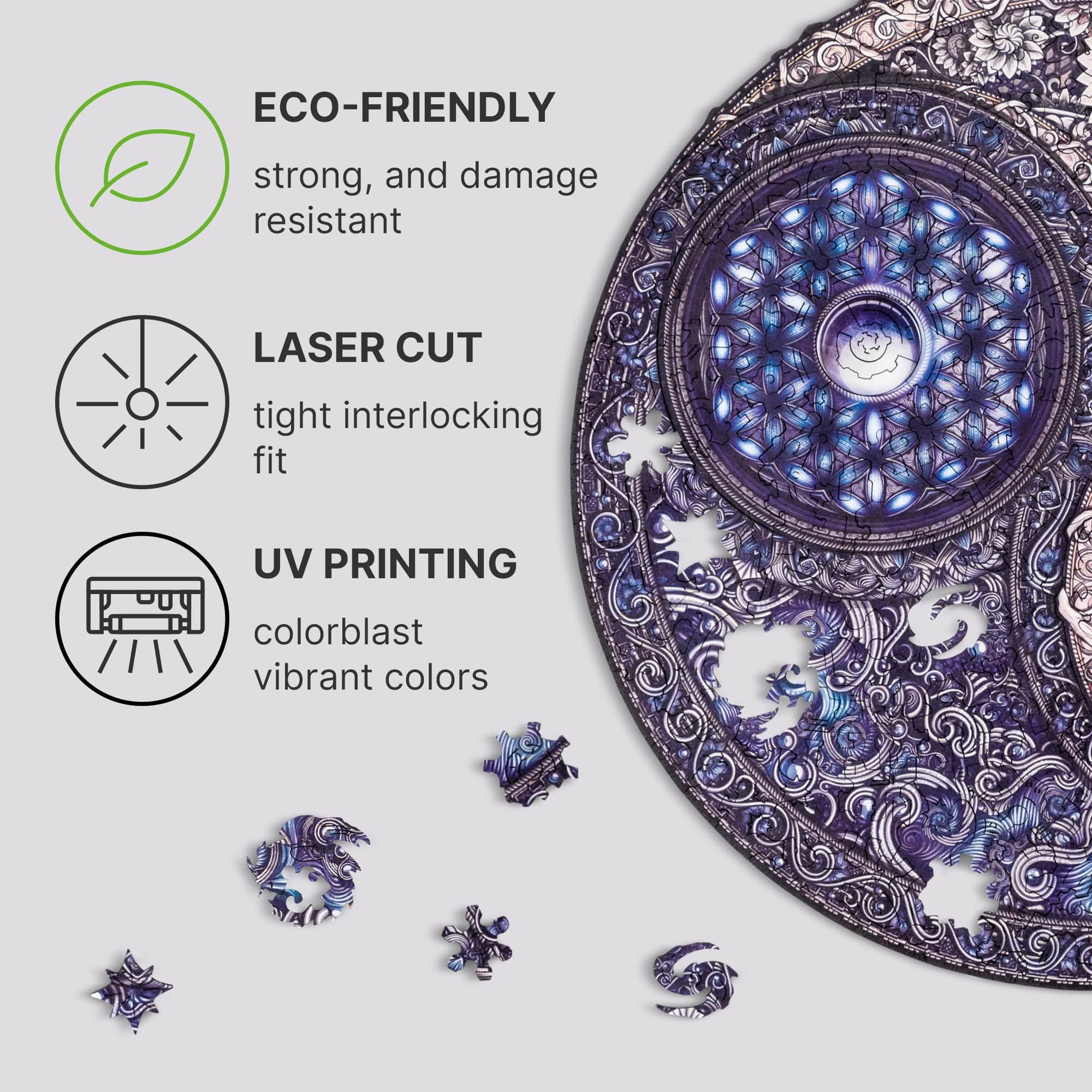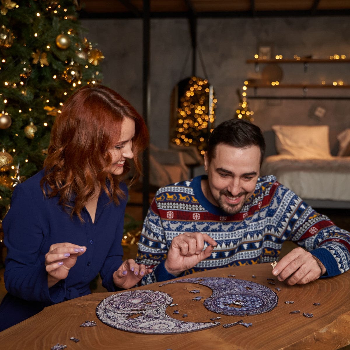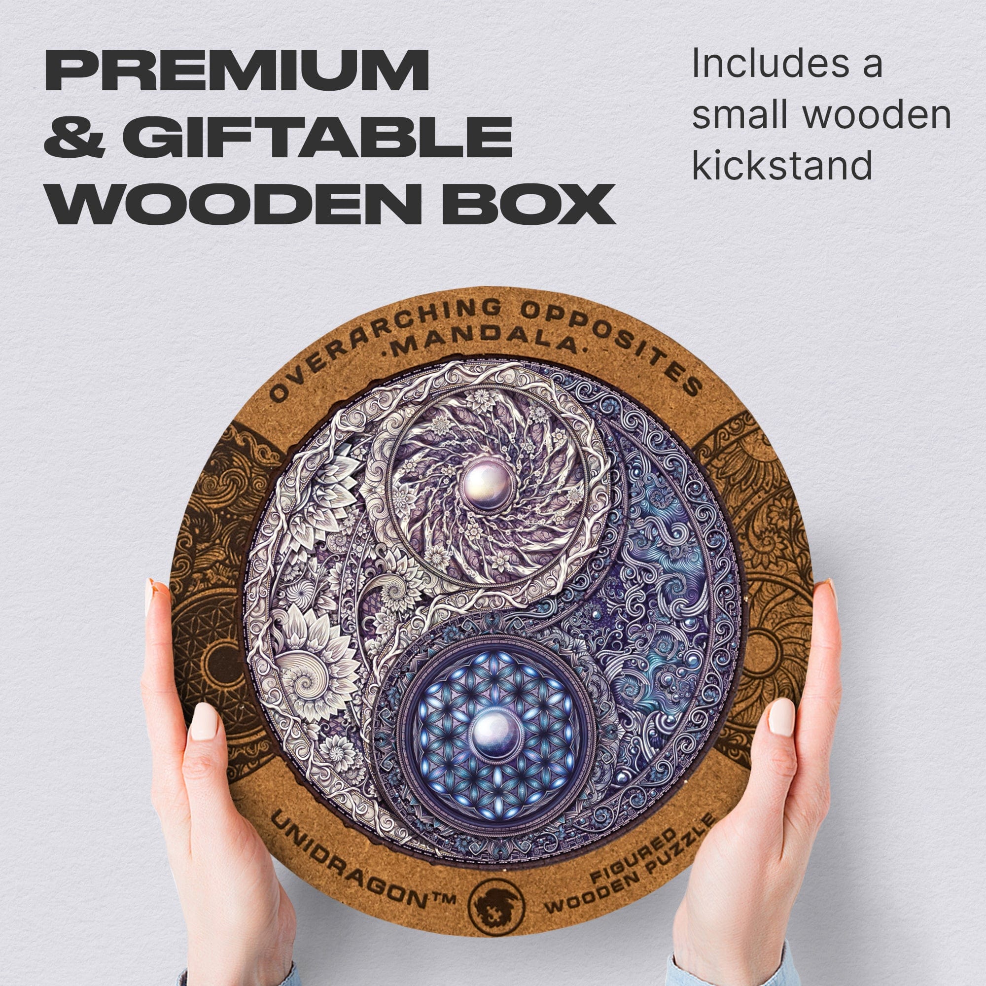 The Yin Yang Wooden Puzzle is not just a beautiful design — it’s a thoughtful symbol of harmony and contrast. Opposites make up our world. Without them, life would have been bland and dull. This idea is reflected in the Mandala Overarching Opposites Puzzle. Its dark half consists of angulated pieces resembling mechanism parts, while the light one is compiled of elements having smooth lines and flowery motives. The puzzle is designed to allow you to build each half separately. But only brought together, they reveal the true meaning of the dual nature of being.