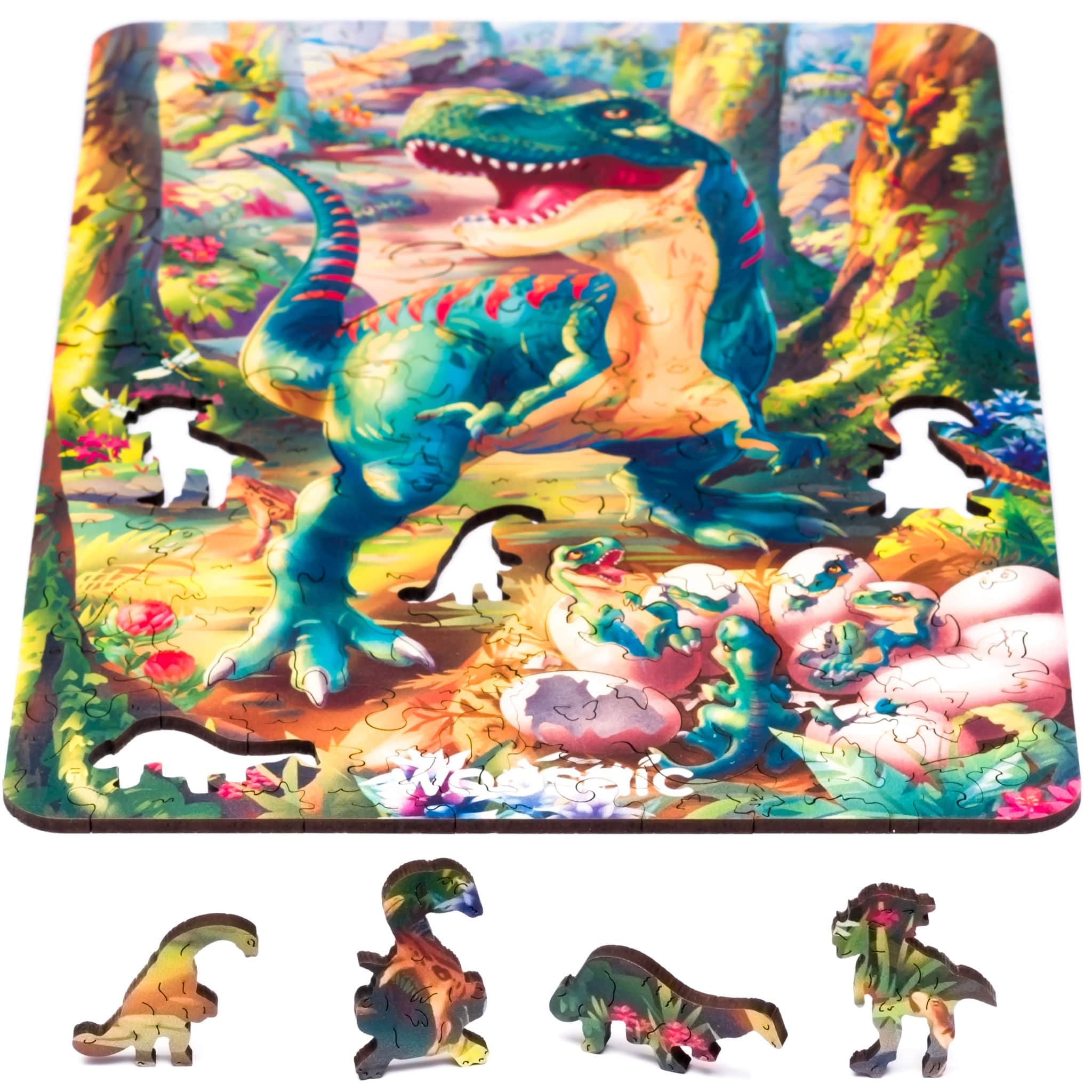 Tyrannosaurus Rex is a real king among dinosaurs. Family of carnivores is depicted in the illustration: T-rex mum and her hatched cubs in a prehistoric forest. At first sight she is a fierce predator with a strong tail and sharp fangs, but just keep looking — you can see happiness and love in her eyes. The T Rex Wood Puzzle delivers a dynamic assembly experience that captures the power and presence of this prehistoric predator.